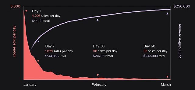 Jak sobie poradził Dustforce? Pierwszego dnia rozeszło się 4 796 cyfrowych kopii produkcji, generując przychód w wysokości 44 tysięcy dolarów. Jak to zwykle bywa w wypadku gier, wysoka sprzedaż nie utrzymywała się zbyt długo – w ciągu pierwszych trzech dni twórcy zarobili tyle, co przez kolejne trzy miesiące. Po dwóch miesiącach od premiery, gracze wydali na Dustforce 243 tysiące dolarów, z czego, po potrąceniu podatków, działki Valve itp., twórcom zostało jakieś 63% tej sumy.