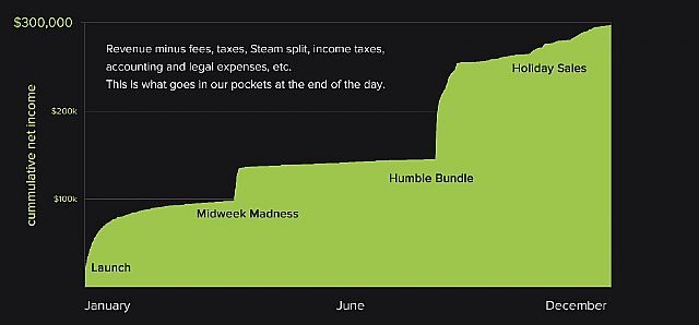 Pierwszy rok życia Dustforce zwieńczyły trzy wyprzedaże na Steamie – promocja z okazji Święta Dziękczynienia, zniżka dzienna oraz oferta bożonarodzeniowa. W ciągu dwunastu miesięcy od premiery, gra zarobiła 668 tysięcy dolarów, z czego do twórców należało 489 tysięcy. Rzecz jasna, prowadzenie biznesu również pochłania sporo środków (opłaty licencyjne, koszt utrzymania serwera, podróże). W końcu, po odjęciu podatku dochodowego, studio zostało z około 295 tysiącami dolarów na koncie. W sumie, z każdych 10 dolarów ze sprzedaży gry, 4,41 dolarów lądowało w kieszeniach twórców. Po podzieleniu na cztery daje to dolara i 10 centów na głowę.