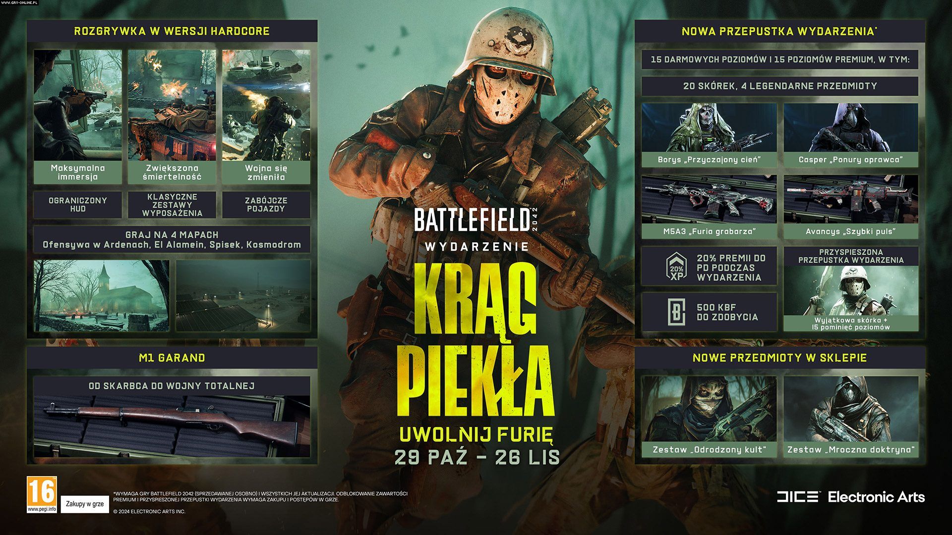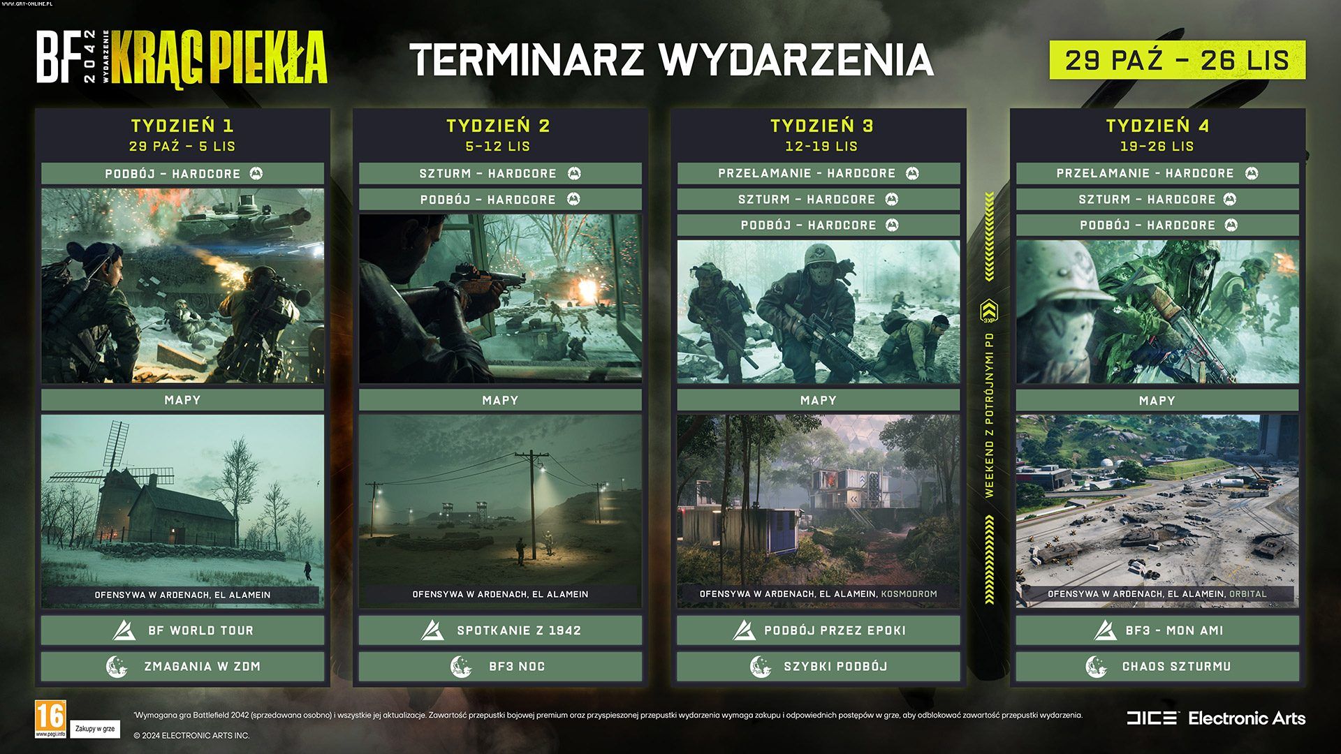Hardcore dostępny będzie w trybach Podbój, Szturm i Przełamanie na mapach: Ofensywa w Ardenach, El Alamein, Spisek oraz Kosmodrom. Przepustka wydarzenia „Krąg piekła” zawierać ma elementy kosmetyczne oraz 30 poziomów – 15 darmowych i 15 premium.