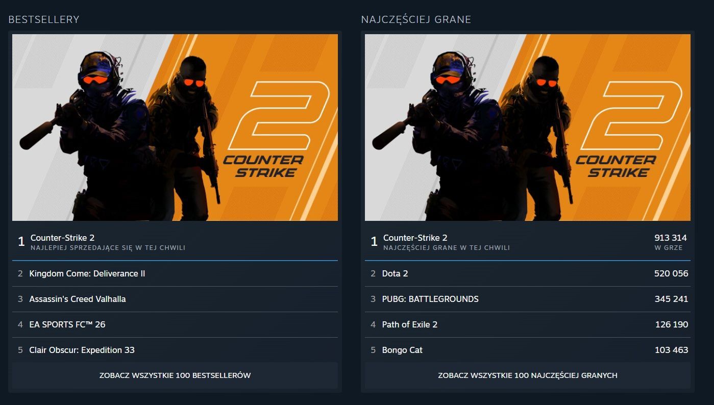 Counter-Strike to bez wątpienia najbardziej żywotny tytuł w historii Steama i niekwestionowany lider na tej platformie. Jasne, ten czy inny wielki hit może czasowo zrzucić CS-a z tronu, a trzy inne gry mają wyższy „peak” graczy wszech czasów. Niemniej prędzej czy później wszystko wraca do normy: Counter-Strike na pierwszym miejscu z co najmniej 600-800 tysiącami użytkowników w grze jednocześnie, reszta konkurencji daleko w tyle.