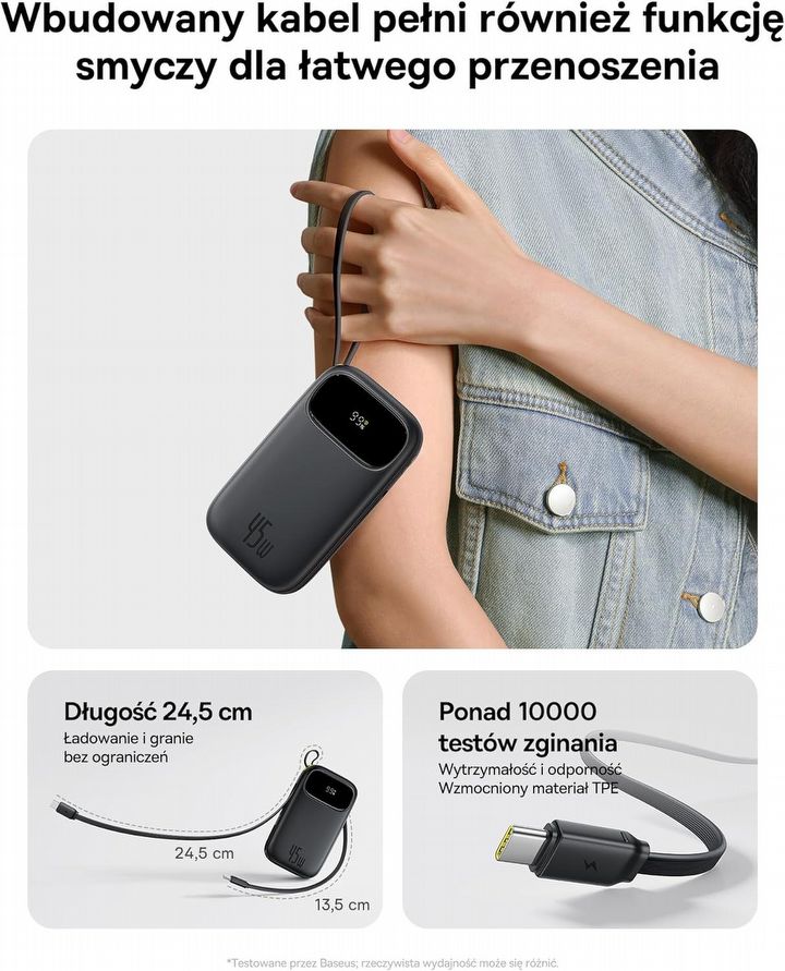 Do tego dochodzą trzy fizyczne porty: dwa USB-C i jeden USB-A. Możesz więc ładować aż cztery urządzenia jednocześnie – dwa przez wbudowane przewody i dwa przez klasyczne złącza. To szczególnie przydatne w podróży, pracy zdalnej, na uczelni, podczas eventów, konwentów czy jakichkolwiek sytuacji, kiedy jesteś z dala od gniazdka, za to w towarzystwie innych, którym też zaraz padnie bateria. Baseus QPow3 to nie tylko powerbank – to centrum ładowania dla całej ekipy.