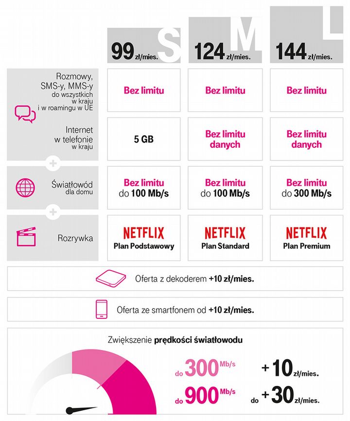Firma T-Mobile poinformowała w specjalnym oświadczeniu prasowym, że 28 czerwca tego roku rozszerzy swoją ofertę o nowe pakiety Magenta 1, łączące kilka usług w jeden, kompleksowy abonament. Dostępne będą dwa warianty – jeden przeznaczony dla domu, a drugi adresowany do klientów biznesowych (firm).