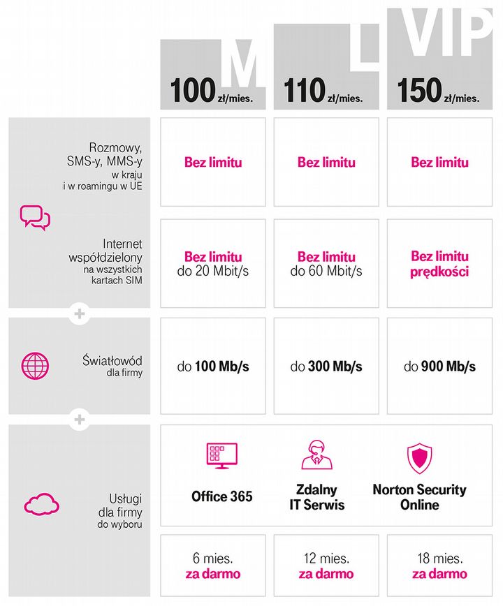 W wariancie firmowym dostęp do Netfliksa zastąpiono usługami, które mogą przydać się przy prowadzeniu biznesu, takimi jak oprogramowanie biurowe Office 365, Norton Security Online (ochrona smartfonów lub tabletów) czy zdalny serwis IT (pomoc ze strony ekspertów T-Mobile). Inaczej prezentują się także pakiety internetowe – są większe i współdzielone (można z nich korzystać równocześnie na wszystkich kartach sim wchodzących w skład abonamentu).