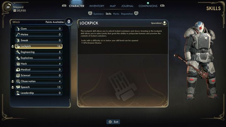Limitowane jest też odblokowywanie atutów (tzn. perków). Możecie wybrać 1 atut co drugi poziom doświadczenia, a więc na przestrzeni całej gry odblokujecie maksymalnie 15 atutów. Dodatkowym ograniczeniem jest to, że niektóre atuty są dostępne tylko dla dostatecznie rozwiniętych umiejętności (np. wymóg 8 punktów Otwierania zamków).