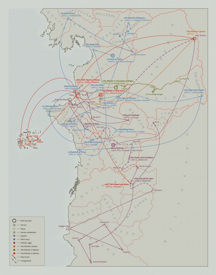 Michaił „uyle” Siergiejew, autor mapy, podzielił się na portalu Behance szczegółami dotyczącymi procesu jej tworzenia. Jak pisze, wziął pod uwagę jedynie podróże opisane w książkach oraz grach.