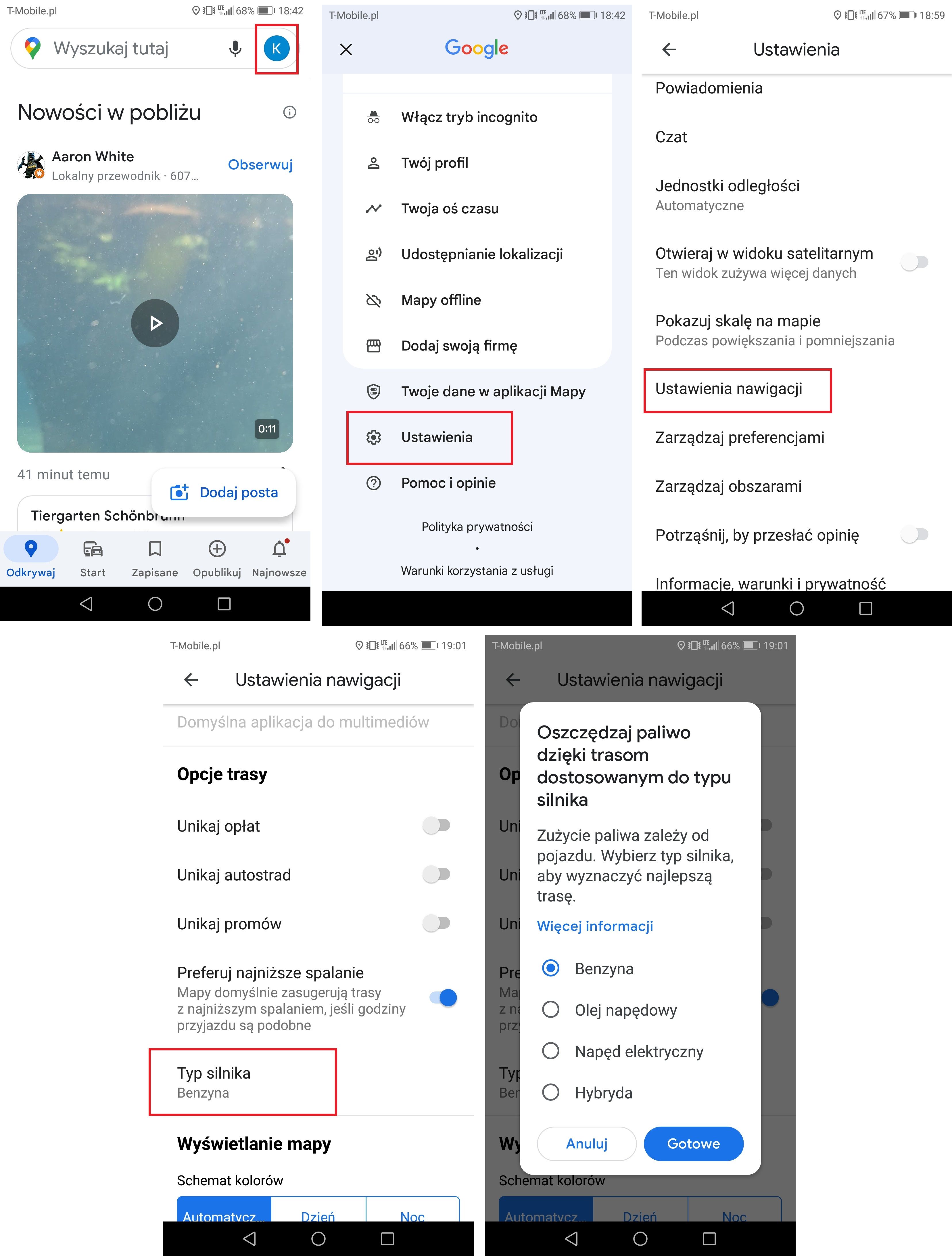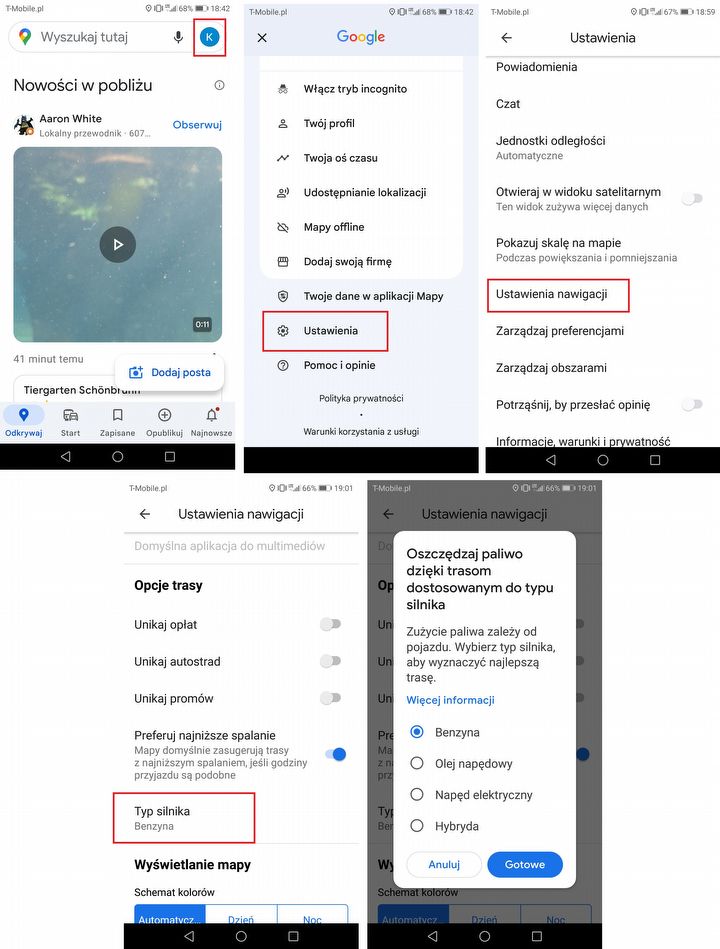 Jeżeli używasz Map Google głównie podczas podróży samochodem, ustaw w aplikacji rodzaju posiadanego silnika jaki napędza Twój pojazd (benzyna, diesel, hybryda, elektryk)