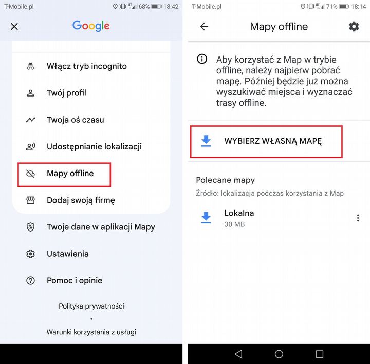 Mapy Google standardowo pobierają dane, korzystając z internetu mobilnego. Aplikacja umożliwia jednak pobranie map do użytku w trybie offline. Nawigacja będzie wtedy działać nawet w miejscach ze słabym zasięgiem lub jego brakiem. (Za granicą, pozwala to również uniknąć opłat roamingowych).