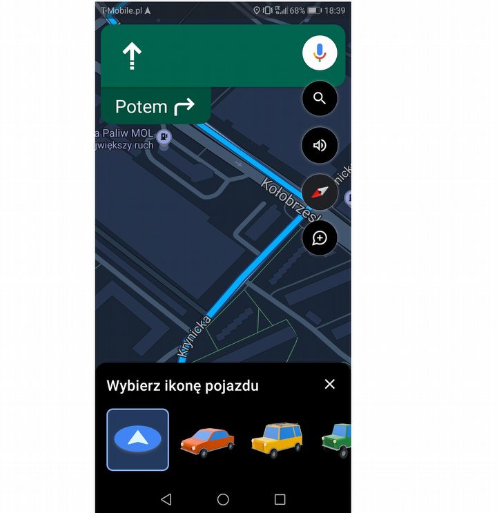 Jeśli znudził Ci się standardowy niebieski wskaźnik nawigacji, Mapy Google pozwalają na jego zmianę. Być może pamiętasz tę opcję z tradycyjnych nawigacji samochodowych.