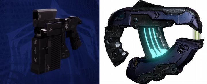 Innym ciekawym przykładem jest V11 Punch, czyli pistolet nieco przypominający Plasma Pistol. Jest to krótki półautomat strzelający kulami energii zamiast zwykłych pocisków, a efektem tego jest dużo sprawniej niszczona tarcza przeciwnika. Oczywiście posiada także strzał ładowany, który gdy trafi - rozbija tarcze jednym strzałem. To właśnie ta cecha najbardziej zbliża go do broni z Halo. A wizualnie? Ten z Marathonu jest bardziej kanciasty, ale jego kształt cały czas przypomina nieco czakram, zabudowując dłoń użytkownika w pierścieniowej konstrukcji.