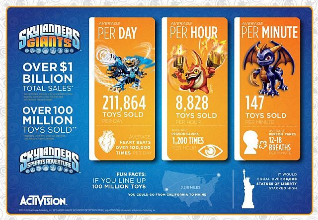 Gry z serii Skylanders pobiły kolejny rekord – sprzedaż detaliczna Skylanders: Spyro’s Adventure i Skylanders Giants wraz z dodatkowymi figurkami do nich przekroczyła próg miliarda dolarów na rynku światowym, do osiągnięcia czego wystarczyło jedyne 15 miesięcy. Ten wynik pokazuje, że figurki do gry sprzedają się lepiej niż inne, niezwykle popularne produkty przeznaczone dla dzieci, m.in. zabawki spod znaku Beyblades, Star Wars i Transformers.