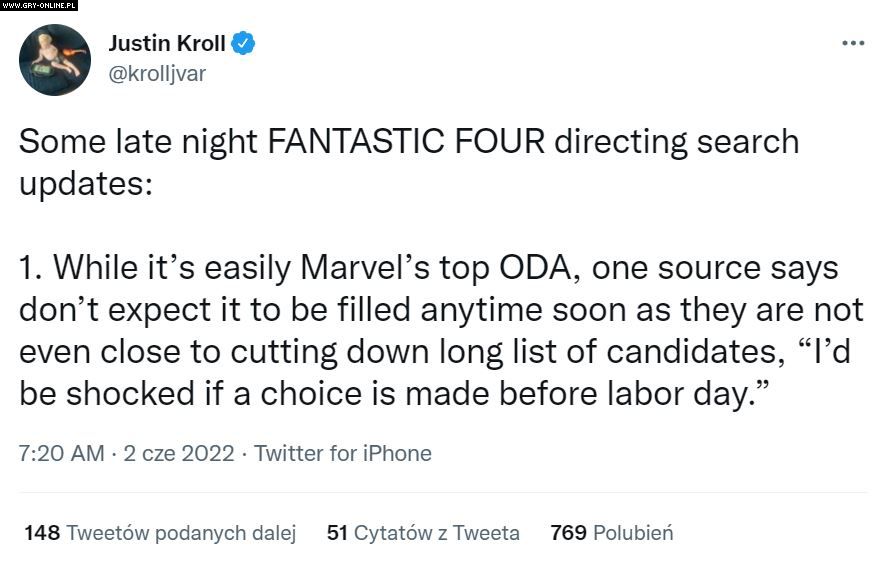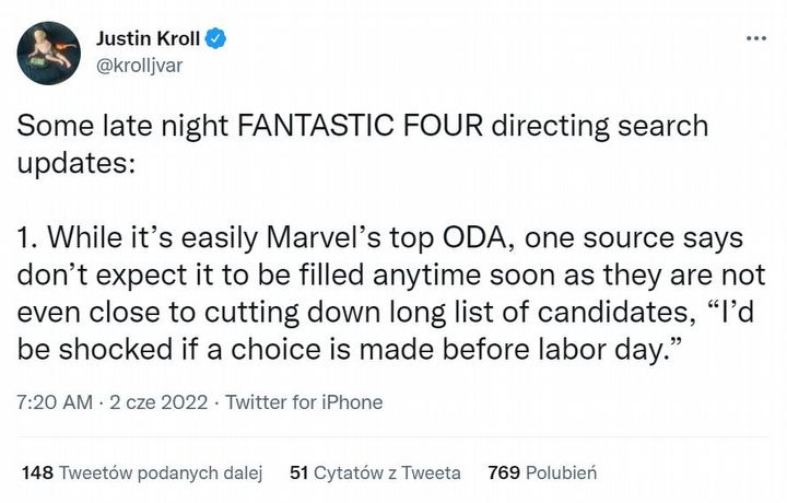 Z informacji, jakie podał na Twitterze Justin Kroll, wynika, że osoby decyzyjne w Marvel Studios nie są jeszcze bliskie zawężenia potencjalnej listy kandydatów. Jego źródło podaje, że w najbliższych miesiącach nie powinniśmy liczyć na to, że poznamy nazwisko reżysera Fantastycznej Czwórki.