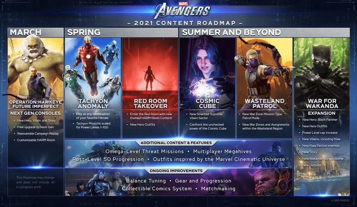 Pomimo bardzo słabego startu, jaki zanotowało Marvel’s Avengers, Square Enix dalej inwestuje w produkcję. Podczas internetowego wydarzenia Square Enix Presents przedstawiono plany dotyczące długotrwałego rozwoju gry. Firma stara się więc wyjść naprzeciw oczekiwaniom, jakie wyrażali gracze. Tytuł wzbogaci się o nowe wydarzenia, misje oraz kosmetyczne zmiany. Do gry dodany zostanie również Czarna Pantera (Black Panther) i nowa zawartość fabularna.