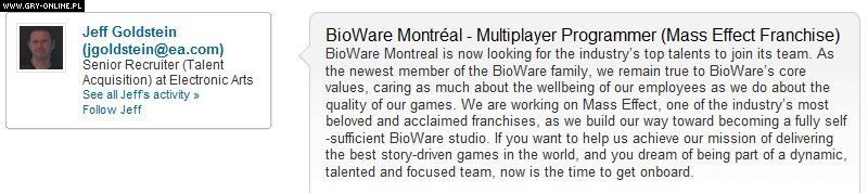 Studio odpowiedzialne za jedne z najlepszych elektronicznych RPG-ów poszukuje programisty specjalizującego się w multiplayerze – oferta dotyczy pracy w oddziale BioWare Montreal i najwyraźniej jest powiązana z Mass Effectem. Obecnie ogłoszenie na to nie wskazuje, ale jak dowodzi Cinema Blend, wcześniej w jego tytule i treści pojawiła się nazwa produkcji.