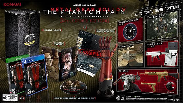 Studio Konami ujawniło bogatą edycję kolekcjonerską gry Metal Gear Solid V: The Phantom Pain. Wspomniana zawartość skierowana zostanie wyłącznie dla posiadaczy obecnej generacji konsol (PS4 oraz XOne) i wyceniona została na 99,99 funtów, czyli ponad 570 złotych. Deweloperzy szykują również nieco uboższą edycją specjalną o nazwie Day 1 Edition.