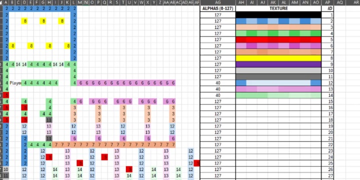 Następnie przygotował on sam labirynt w Excelu. Jak możemy zauważyć na powyższym zdjęciu pola będące częścią labiryntu są ponumerowane oraz oznaczone różnymi kolorami. Choć nie zostało to napisane wprost, to możemy przyjąć, że ważne są jedynie wartości w poszczególnych polach. Kolory zaś zostały dodane jedynie, aby łatwiej rozplanować labirynt. Wskazuje na to fakt, że po prawej stronie mapy znajduje się tabela z adresami ID poszczególnych tekstur.