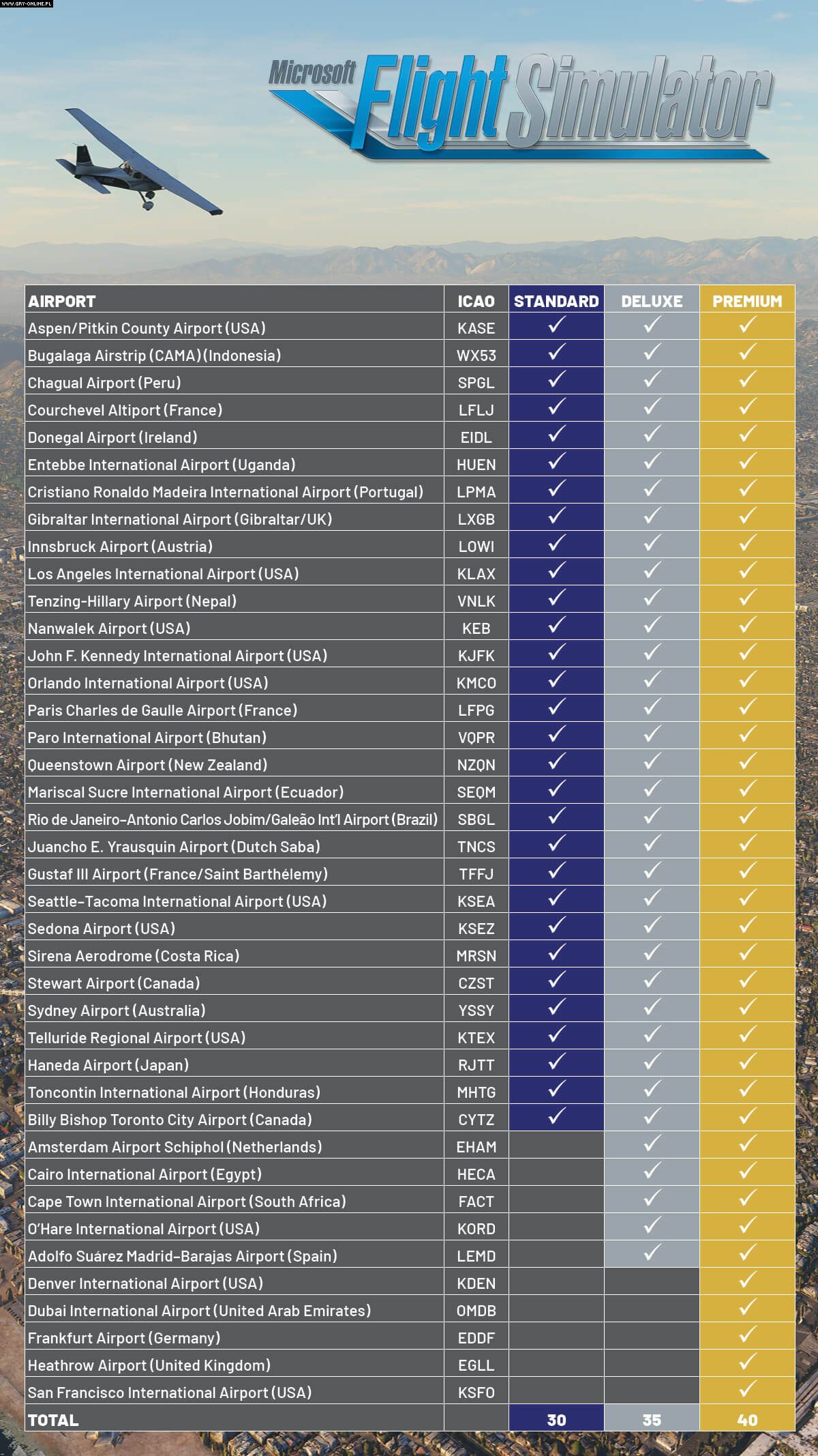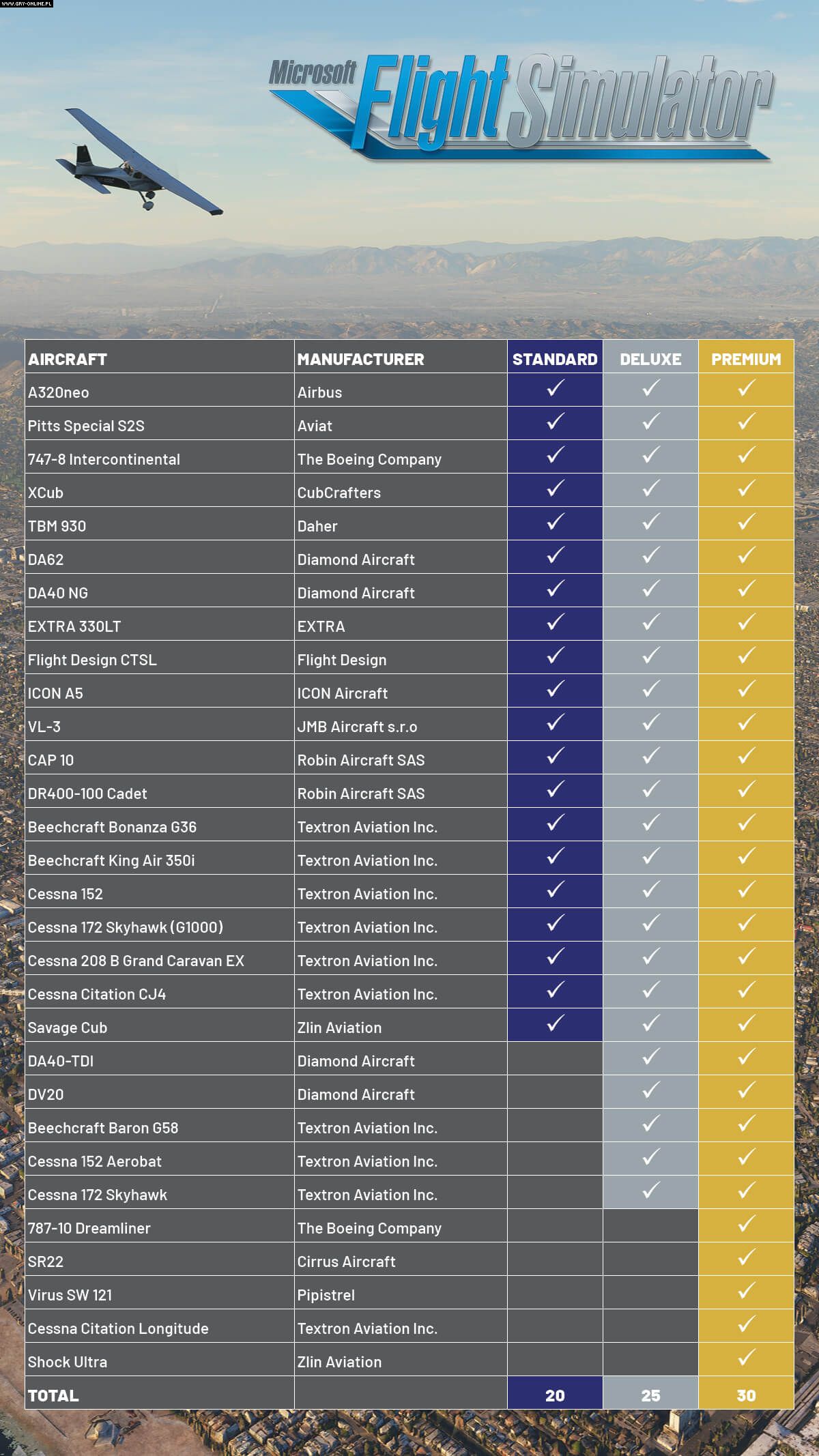 Różnice między droższymi wersjami objawią się w postaci dostępu do samolotów oraz lotnisk. Tak więc w wersji standardowej zasiądziemy za sterami 20 maszyn i odwiedzimy 30 ręcznie stworzonych lądowisk. Natomiast wersja Premium Deluxe zapewni łącznie 20 dodatkowych elementów, w tym dostęp do Dreamlinera oraz największych lotnisk, np. w Dubaju i San Francisco. Pełną listę różnic znajdziecie na grafikach poniżej.