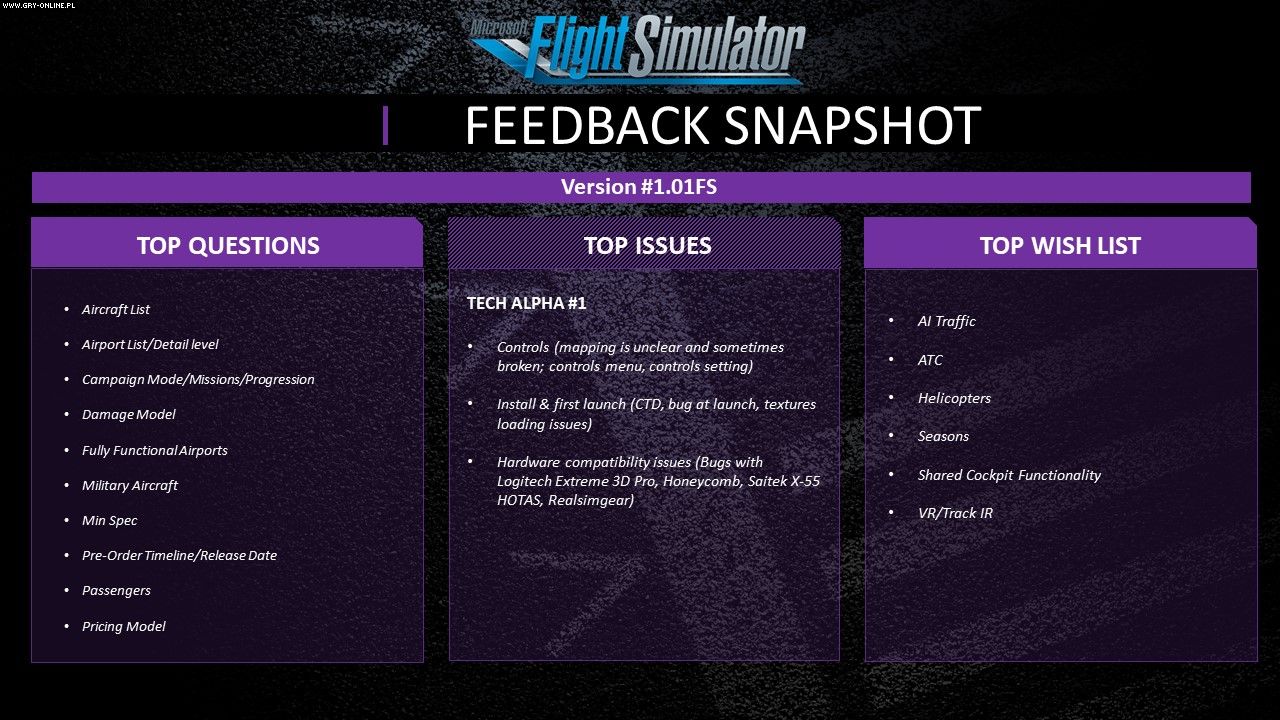 Microsoft zwraca również uwagę na najczęściej pojawiające się błędy oraz życzenia graczy. Wśród tych pierwszych znalazły się m.in. problemy z instalacją, pierwszym uruchomieniem, a także kompatybilnością z niektórymi urządzeniami. Fani natomiast chcieliby np. wreszcie poznać minimalne wymagania sprzętowe gry, datę jej premiery czy też zobaczyć helikoptery oraz pory roku.