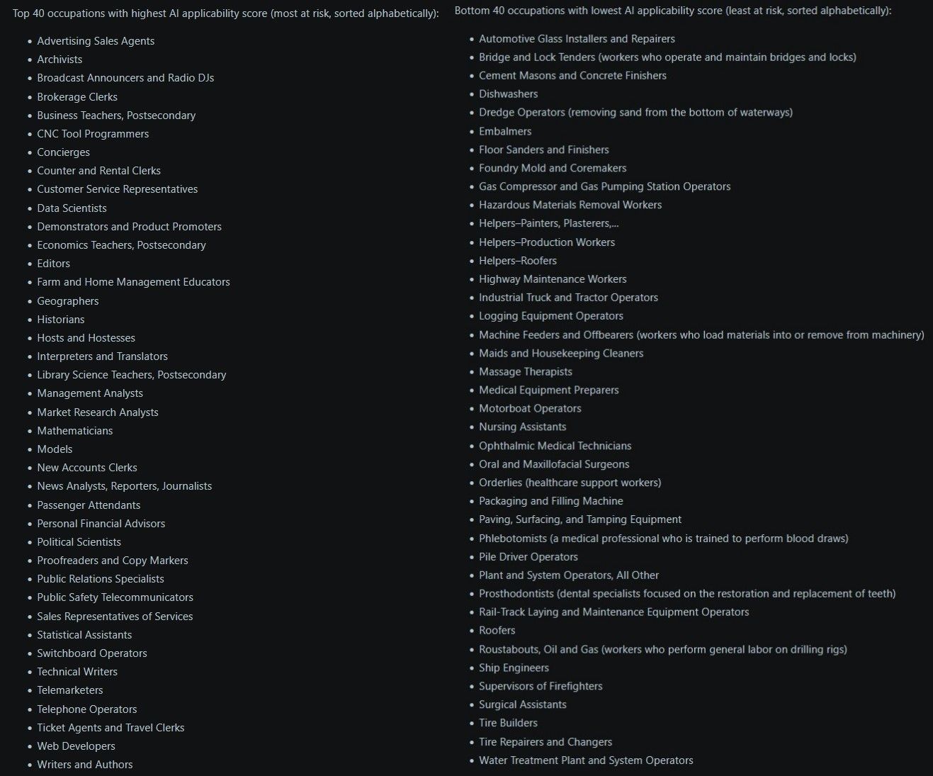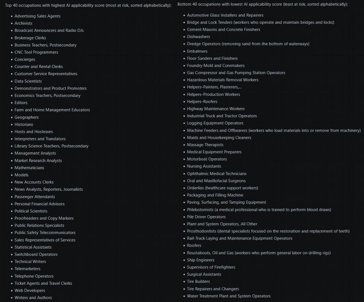 Zestawienie składa się z 40 zawodów najbardziej zagrożonych przez AI i najmniej zagrożonych zastąpieniem przez nową technologię. Na subreddicie r/ChatGPT internauci szybko zwrócili uwagę, że listy nie mógł stworzyć człowiek, bo wybór zawodów do poszczególnych kategorii jest dziwny.