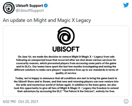 [...] Nasze zespoły spędziły ostatnich kilka miesięcy na badaniu i testowaniu różnych rozwiązań, aby upewnić się, że wrażenia graczy są zgodne z naszymi standardami pod względem jakości usług. Dzisiaj z przyjemnością ogłaszamy, że zostały spełnione wszystkie warunki, aby przywrócić grę do Ubisoft Store i na Steam. Nowi i powracający gracze mogą ponownie zapuścić się w rozległy i tajemniczy świat Ashan. [...]