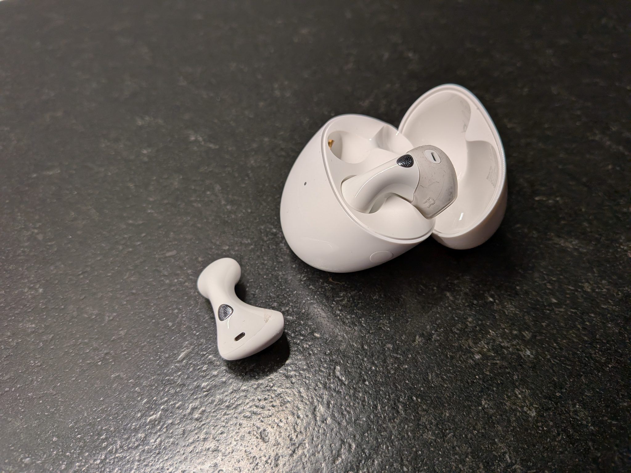 Zgodnie z deklaracjami producenta, otrzymujemy klasyczny czas pracy, sięgający 6 godzin bez ANC i 4,5 godziny z włączoną redukcją hałasu. Nie są to złe wartości, stanowią też poprawę względem poprzedniego modelu, choć chcąc słuchać muzyki przez cały dzień pracy konieczne będzie zrobienie przerwy gdzieś w środku. Na szczęście mamy dość szybkie ładowanie – 5 minut ma wystarczyć na nawet 2,5 godziny dalszego słuchania, więc krótka przerwa na kawę bez muzyki powinna rozwiązać sprawę.