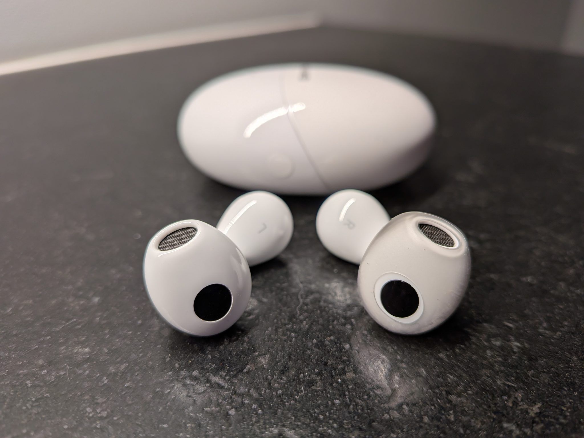 Słuchawki są wykończone w ten sam sposób. Powierzchnia jest dość śliska, jednak nie jest to problemem dzięki kształtowi „kropli wody”, który pozwala pewnie chwycić je i umieścić w uchu. FreeBuds 6 są wygodnie wyprofilowane i intuicyjnie układają się odpowiednio w uchu, przez co nie powinniśmy mieć problemów z ich założeniem.