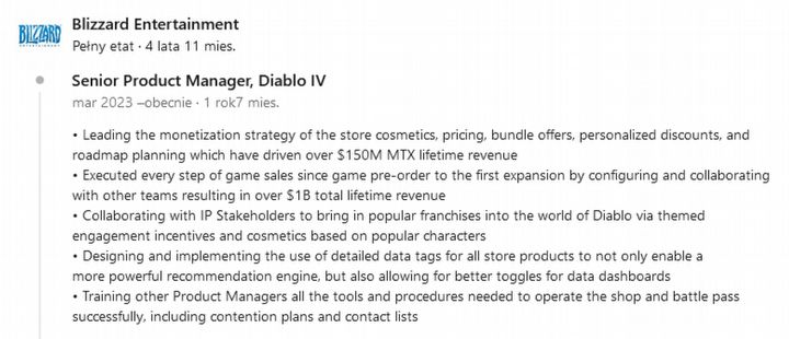 O dziwo, owa informacja nie została opublikowana na oficjalnej stronie dewelopera, ale na profilu Froeschkego w serwisie LinkedIn, a konkretnie w opisie jego stanowiska. Stamtąd właśnie możemy się dowiedzieć, że Diablo IV odnotowało od premiery ponad miliard dolarów przychodu, w tym około 150 milionów dolarów z dostępnych w produkcji mikropłatności.