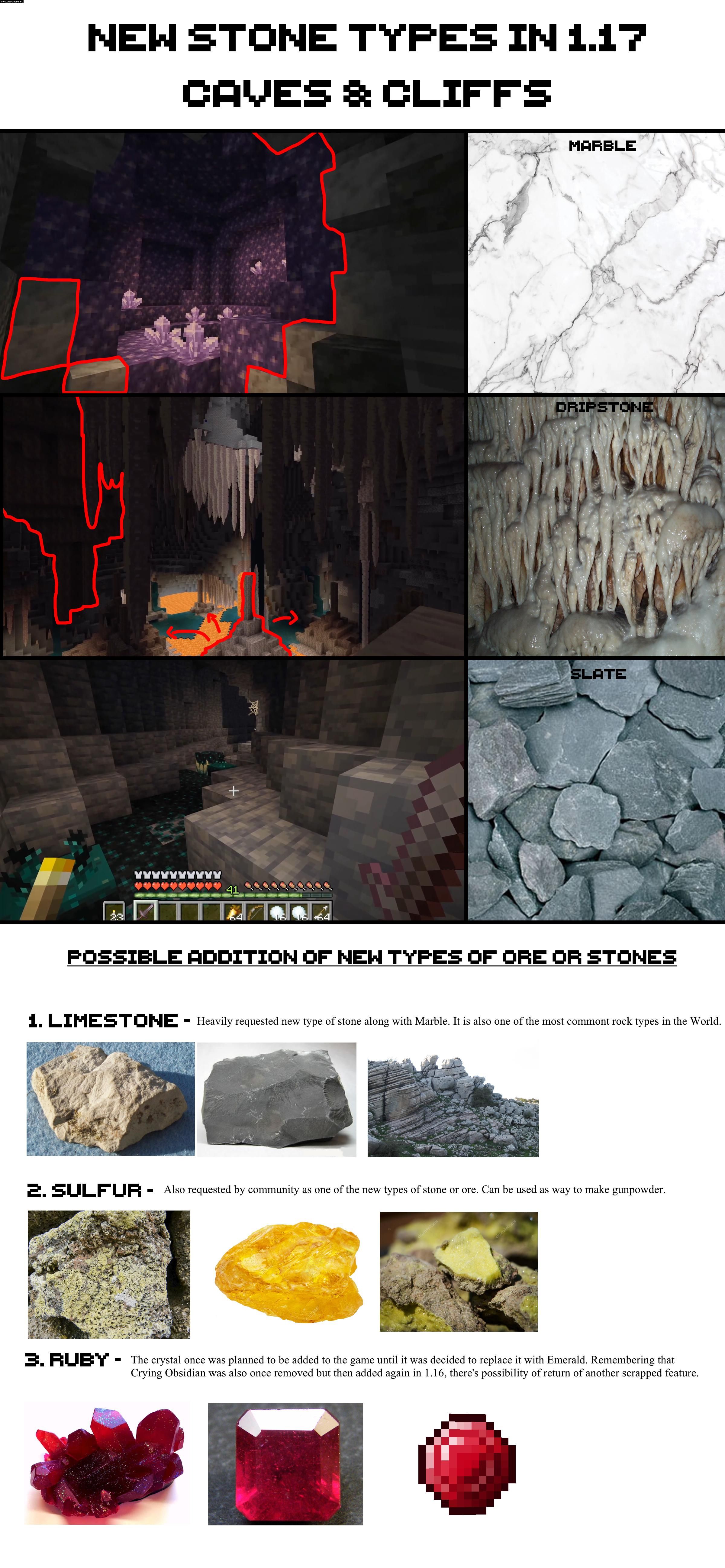 Nowe bloki zawsze wzbudzają ekscytację społeczności skupionej wokół Minecrafta. Dość wspomnieć, że gracze od lat wielokrotnie sugerowali dodanie marmuru do gry. Aktualizacja 1.17 daje studiu Mojang znakomity pretekst do wprowadzenia tego typu nowości. W końcu uaktualnienie skupiające się – zgodnie z tytułem – na jaskiniach nie byłoby pełne, gdyby nie towarzyszyły mu nieobecne wcześniej rodzaje skał. Z tego samego powodu gracze przewidują pojawienie się nowych typów rud oraz kamieni szlachetnych. Oficjalnie wiemy m.in. o miedzi, ale grafika w serwisie Reddit sugeruje choćby powrót rubinów. Te miały pojawić się już dawno, ale ostatecznie zastąpiono je szmaragdami, co – jak zwraca uwagę autor wpisu – spotkało również płaczący obsydian (Crying Obsidian). Ten ostatni jednak ostatecznie trafił do gry, i to całkiem niedawno, bo 23 czerwca w aktualizacji Nether.