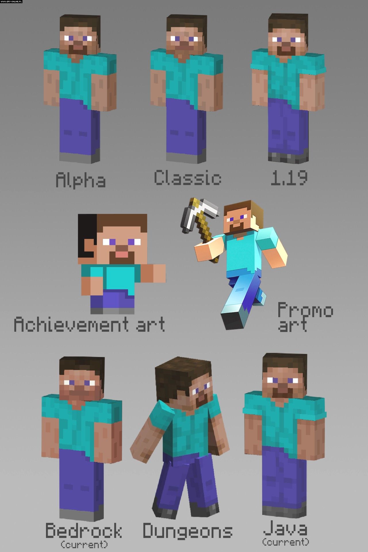 W toku wielokrotnych modyfikacji Minecrafta twórcy starali się również zmieniać wygląd głównej postaci i swoistej maskotki produkcji – poczciwego Steve’a. Na przestrzeni lat pojawiło się zatem kilka większych i mniejszych modyfikacji.
