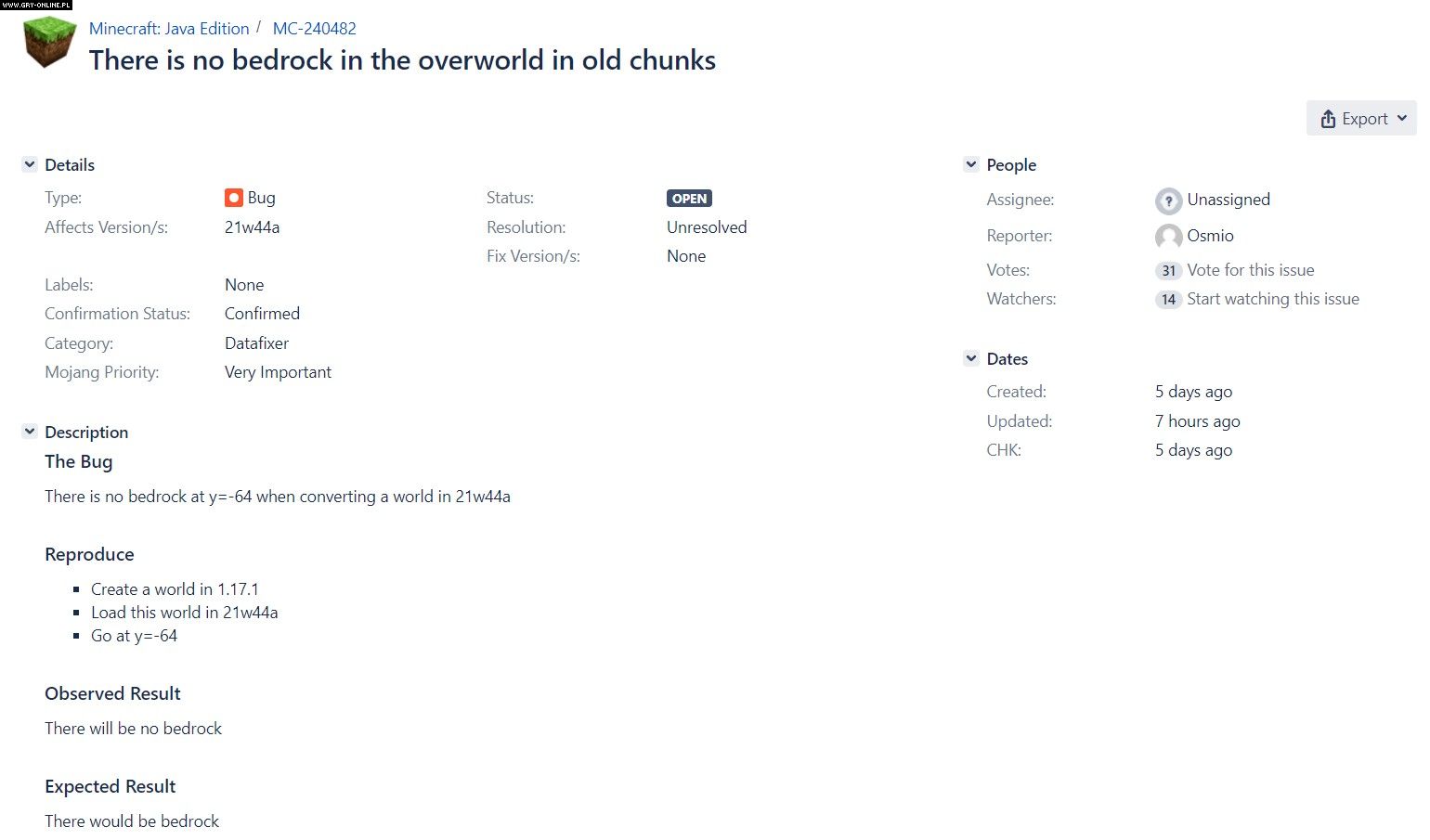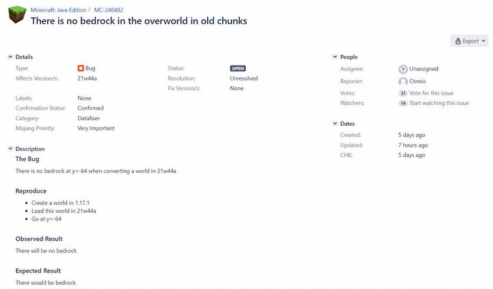 Całość jest częścią przygotowań przed aktualizacją Minecrafta: Java Edition do wersji 1.18 – Caves & Cliffs: Part II (Jaskinie i klify: Część II) – która ma przynieść o wiele bardziej „realistyczną” generację terenu. Snapshot 21w44a jest już ósmą migawką wyżej wspomnianej wersji. Miejmy nadzieję, że twórcy uporają się ze „znikającym” bedrockiem przed jej premierą. Minecraft zarówno w wersji Java, jak i edycji Bedrock są od niedawna dostępne w subskrypcji Xbox Game Pass.