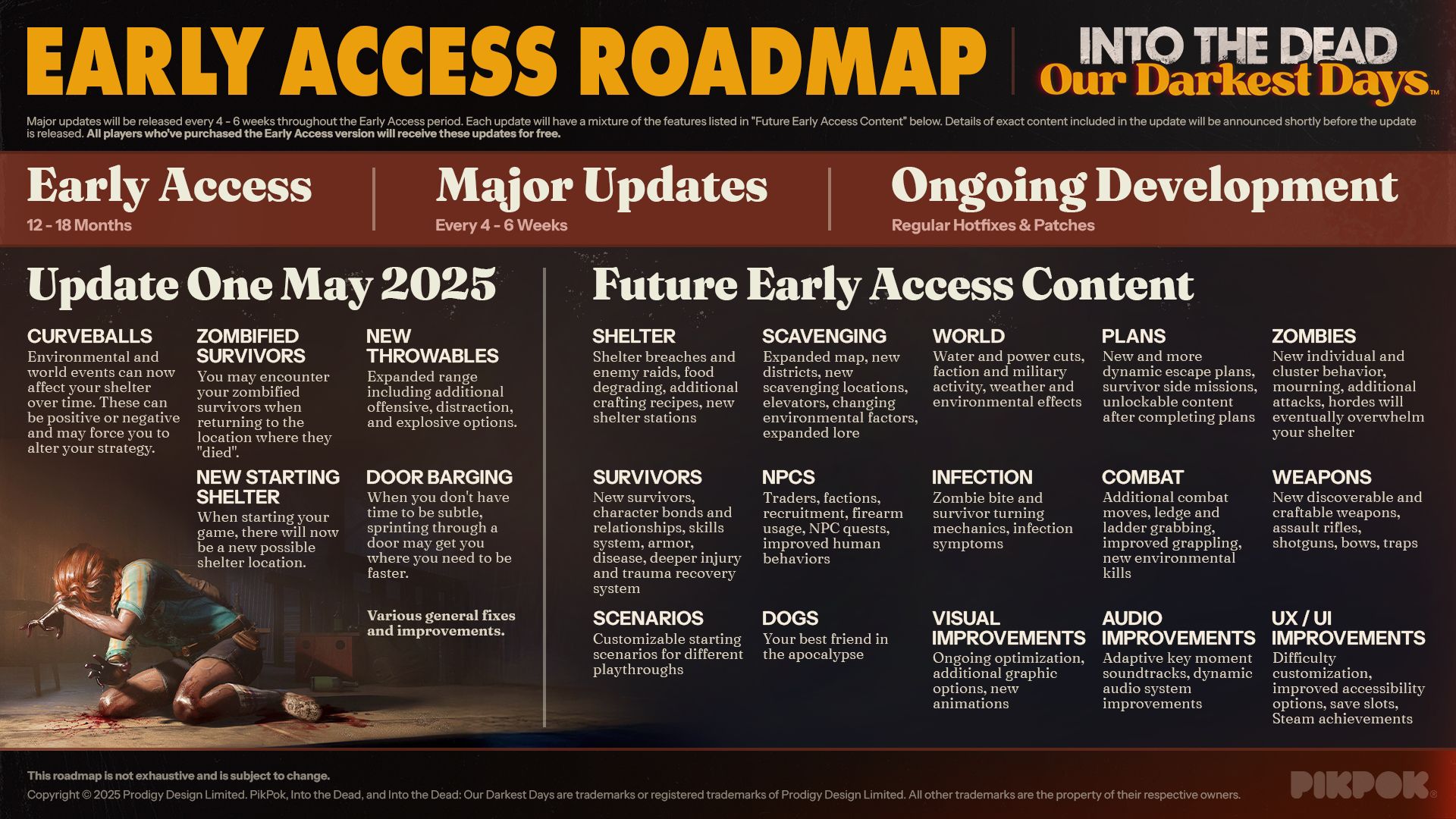 Z udostępnionego jakiś czas temu wpisu twórców na platformie firmy Valve dowiedzieliśmy się co nieco na temat planów rozwoju Into the Dead: Our Darkest Days. Ma on potrwać około 12–18 miesięcy, a deweloperzy chcą wydawać kolejne aktualizacje co 4–6 tygodni. Pierwszy update zostanie wypuszczony w maju i oprócz ogólnych ulepszeń oraz poprawek wprowadzi: