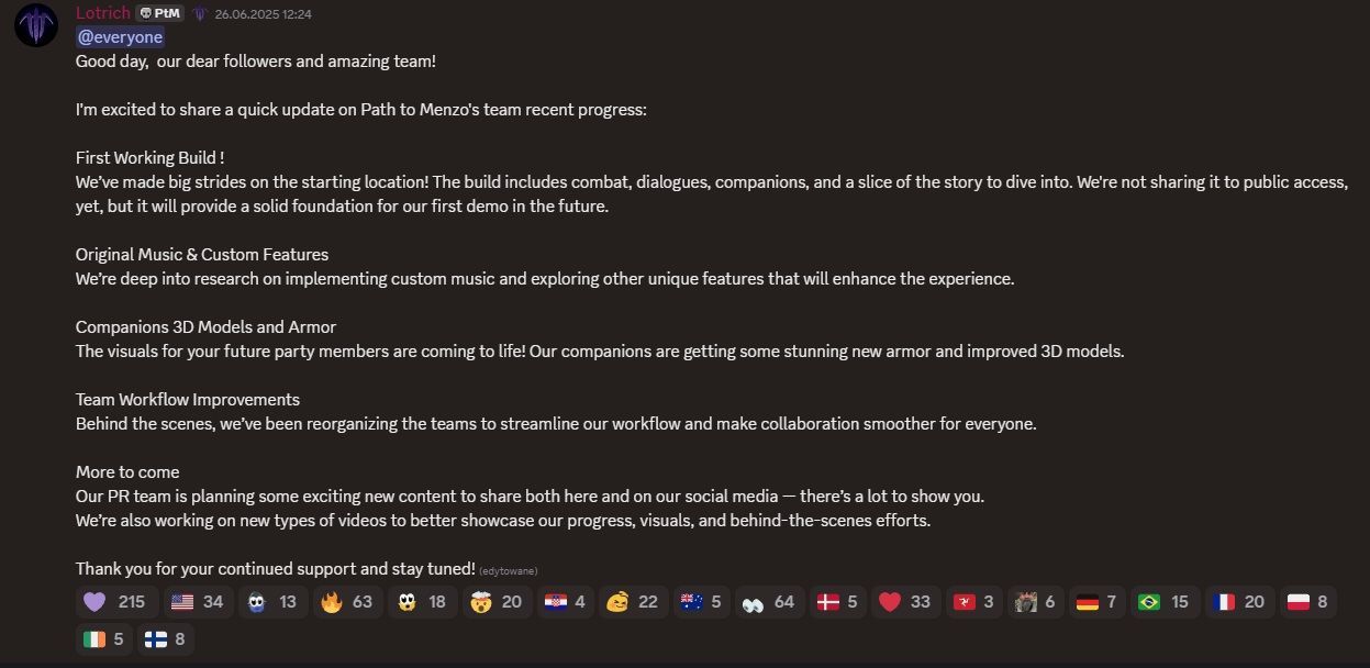 Lotrich, przywódca i pomysłodawca całego projektu podzielił się bowiem ze społecznością twórców i fanów moda na Discordzie ogłoszeniem, w którym zawarł informację o tym, że Droga do Menzoberranzanu ma już pierwszy grywalny build. Oznacza to, że moderzy w dużym stopniu opracowali pierwszą lokację, walki, dialogi, odpowiednio rozpisanych towarzyszy, a nawet fragment fabuły.