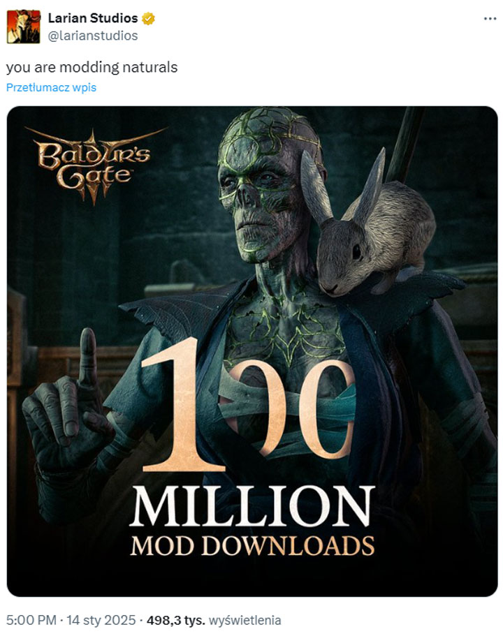 We wrześniu ubiegłego roku Baldur’s Gate 3 otrzymało oficjalne narzędzia moderskie. Okazało się to strzałem w dziesiątkę. Studio Larian pochwaliło się, że od momentu premiery tej aktualizacji fani z oficjalnej strony oraz serwisu mod.io pobrali różnorodne modyfikacje już ponad 100 mln razy.