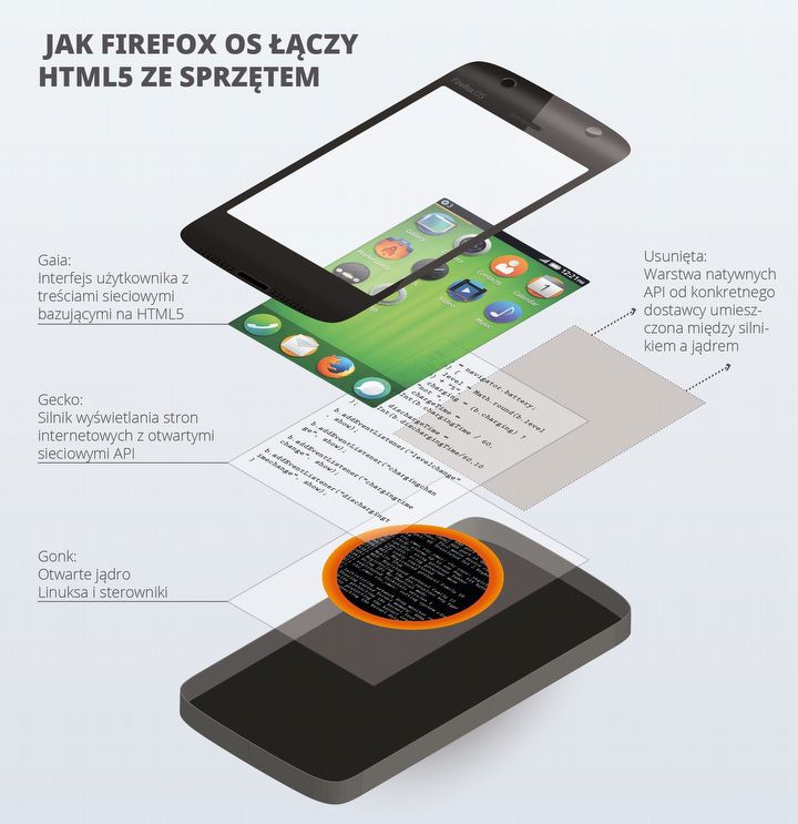 W pewnym momencie ktoś w Fundacji Mozilla pomyślał: skoro nie robimy systemu dla komputerów, to zróbmy OS dla smartfonów i zaawansowanych „featurephonów”, oparty o Linuxa i naszą przeglądarkę internetową. I tak w 2012 roku narodził się B2G czyli „Boot to Gecko” składający się właśnie z okrojonego jądra Linuxa i Gecko, czyli silnika renderowania przeglądarki internetowej Firefox.