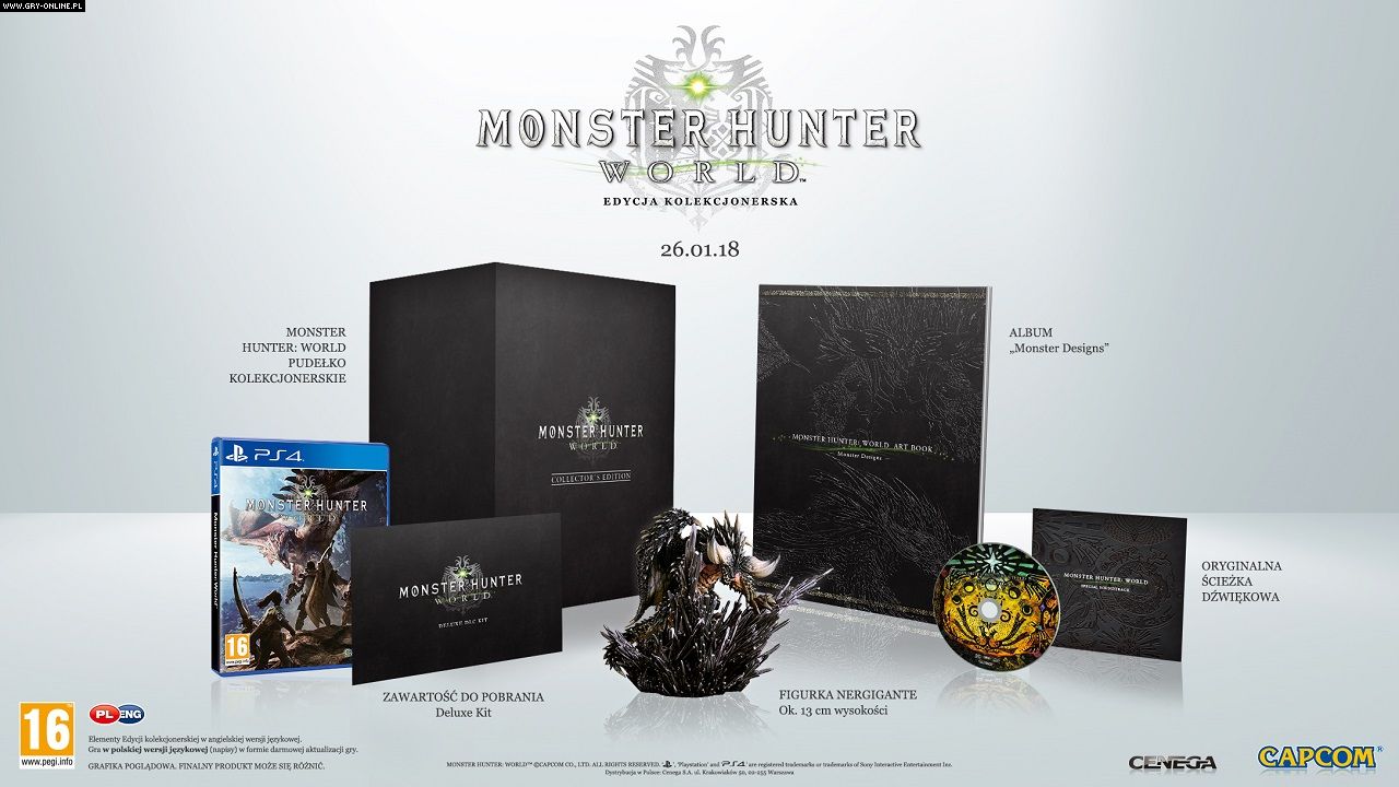 Cenega, rodzimy dystrybutor gry Monster Hunter World od firmy Capcom, poinformowała, że tytuł ukaże się w naszym kraju w polskiej (napisy) i angielskiej wersji językowej. Premiera odbędzie się 26 stycznia 2018 roku na konsolach Xbox One i PlayStation 4. Co ciekawe, plików z lokalizacją nie znajdziemy od razu na płycie, gdyż będą one dostępne w postaci darmowej aktualizacji. Ponadto zdradzono, że pre-ordery na grę premiowane są w wybranych sklepach specjalnym pancerzem i/lub przedmiotem oferującym ulepszenia do obrony i ataku oraz umiejętności zbieractwa. Dodatkowo dowiedzieliśmy się, że u niektórych sprzedawców można już zamawiać edycję kolekcjonerską, zawierającą następujące elementy:
