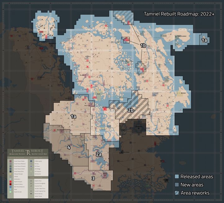 Zamieszczona wyżej mapa pokazuje regiony już dodane do Tamriel Rebuilt oraz te, które otrzymamy w najbliższych rozszerzeniach. Wystarczy porównać ją z wyspą Vvardenfell i oficjalnymi mapami Tamriel (via Imperial Library), by przekonać się, jak bardzo ambitny jest to projekt. Dodajmy do tego konieczność poprawienia starszych regionów, by nie odbiegały od nowszych dodatków. Nie mówimy tu tylko o stworzeniu pustych lokacji – każde miejsce ma własną zawartość, wliczając w to miasta i ich mieszkańców, faunę, florę itd.