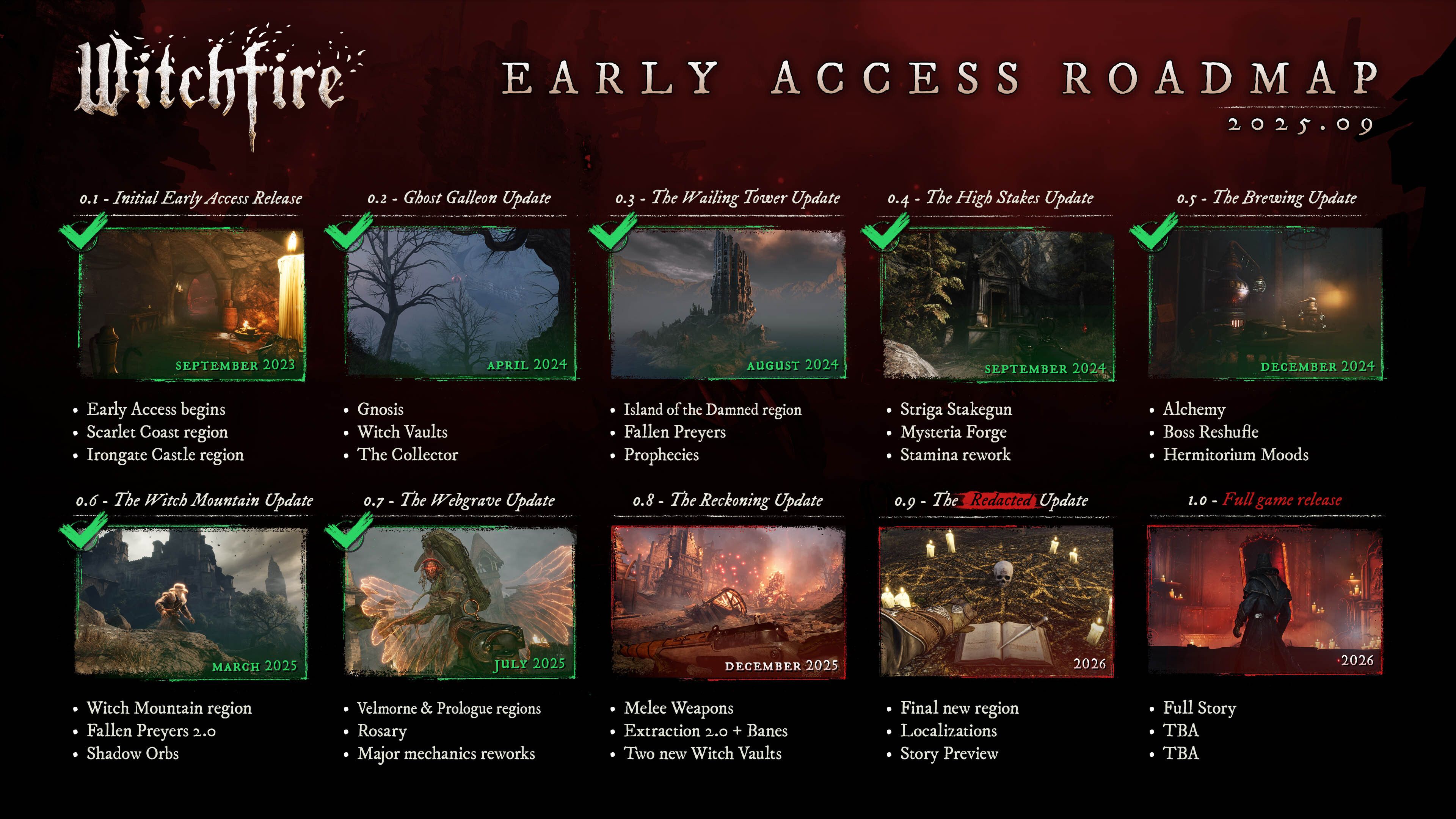 Polskie studio The Astronauts podzieliło się nową „mapą drogową” dla strzelanki Witchfire. Poza planowanymi aktualizacjami zmierzającymi do gry twórcy przypomnieli też o już zrealizowanych etapach produkcji – z poniższej grafiki wynika, że wczesny dostęp wielkimi krokami do końca zbliża się.