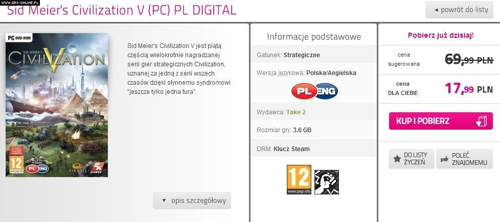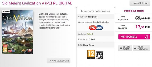 Jeżeli jeszcze nie mieliście okazji zagrać w ten tytuł i skusicie się na dzisiejszą promocje, to przyszykujcie się na ściągnięcie 3,6 GB danych. Gra oferowana jest w polskiej wersji językowej. Ponadto u tego samego sprzedawcy możecie nabyć różne dodatki do Sid Meier's Civilization V, których ceny zaczynają się od 12,99 zł.