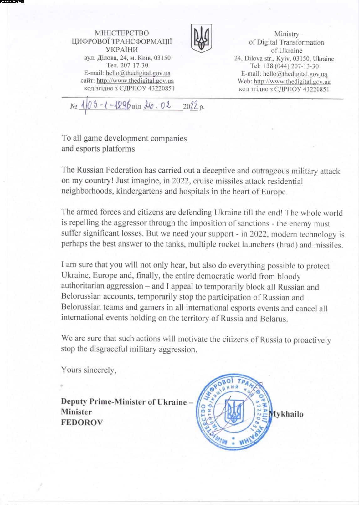 Mychajło Fedorow prosi deweloperów oraz organizacje e-sportowe o pomoc i podjęcie akcji przeciwko Rosji. Wzywa m.in. do wyłączenia usług oraz blokowania rosyjskich użytkowników.