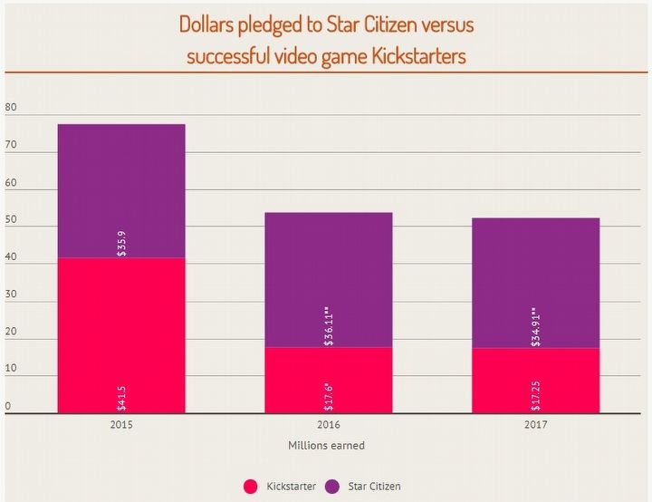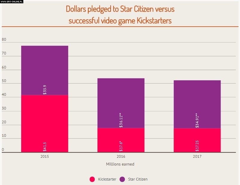Z wyliczeń serwisu Polygon wynika, że twórcom gry Star Citizen udało się pozyskać od graczy w 2017 roku 34,91 miliona dolarów, a więc nieco mniej niż w 2016 roku, kiedy to zebrano 36,11 miliona dolarów. Jednak i tak jest to zdecydowanie więcej niż łączny wynik osiągnięty przez wszystkie projekty z serwisu Kickstarter w zeszłym roku, na które przeznaczono 17,25 miliona dolarów (17,6 miliona w 2016 roku). Mało tego, jak widać rezultat kosmicznego symulatora jest lepszy niż zsumowana kwota ponad 700 gier sfinansowanych w ostatnich dwóch latach na Kickstarterze. Co prawda w artykule zaznaczono, że w wyliczeniach Star Citizena nie brano pod uwagę zwrotów, ale raczej nawet z nimi wynik byłby znakomity.