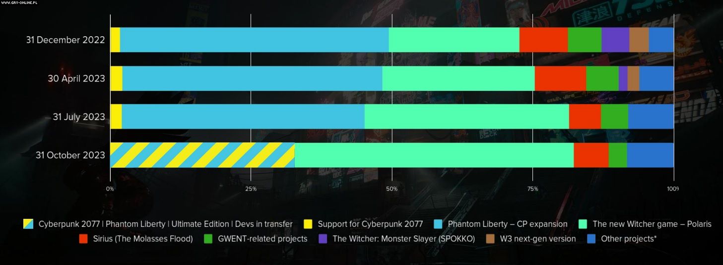 Niemniej nie samym „Cyberem” stoi Grupa CD Projekt. Z przedstawionego w raporcie wykresu wynika, że Project Orion – czyli sequel Cyberpunka 2077 – rozwija obecnie zaledwie garstka deweloperów. Pozycja ta nie ma nawet osobnej kategorii w legendzie – należy założyć, że została ona zakwalifikowana do „pozostałych projektów”, nad którymi pracuje mniej niż 10 osób.