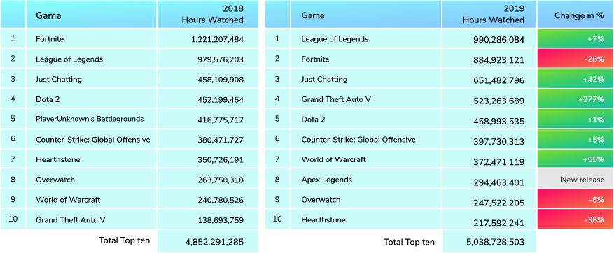 Zaskakujący może być fakt, że Fortnite zaliczył spory spadek oglądalności i stracił pozycję lidera w klasyfikacji na rzecz League of Legends. W tym roku największy skok zaliczyło jednak Grand Theft Auto V, ze wzrostem na poziomie 277%.