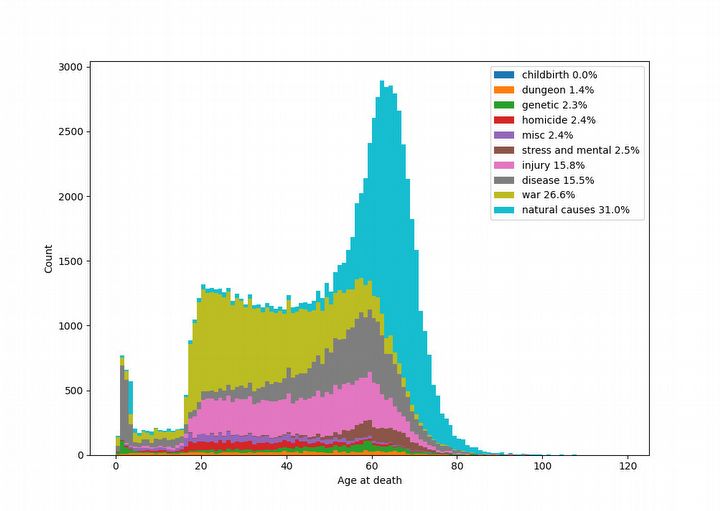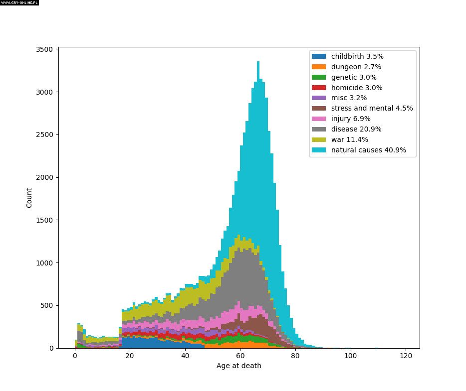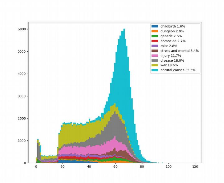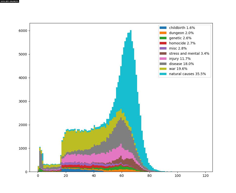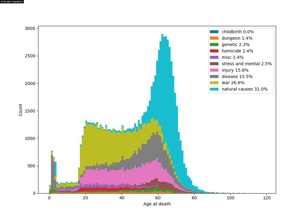 Na podstawie zebranych danych powstał poniższy wykres. Oś pozioma prezentuje kolejne lata życia postaci, a pionowa częstotliwość zgonów w danym wieku oraz ich powody.