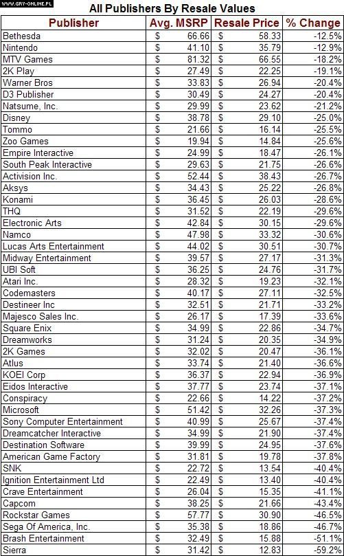 Okazuje się, że gry wymienionych wyżej firm tracą na wartości średnio jedynie od 12,5% do 18,2%. Dobre wyniki uzyskały ponadto produkcje 2K Play, Warner Bros., D3 Publisher oraz Natsume. Na dnie rankingu znalazły się z kolei najwięksi wydawcy i twórcy z Rockstar Games, Capcom, Microsoftem i Sony na czele. Wpływ na to ma zapewne fakt, że na rynku znajduje się zazwyczaj ogromna liczba ich produkcji, co ma oczywiście wpływ na automatyczne zbijanie cen na aukcjach internetowych.
