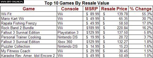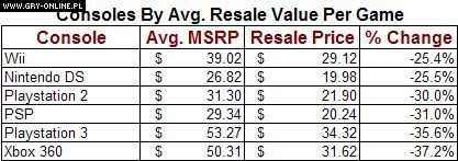 Spośród gier wydawanych na konkretne konsole najlepiej pod kątem utrzymywania wartości radziły sobie produkcje powstające z myślą o Nintendo Wii (średnio -25%). Tuż za najnowszą stacjonarną platformą japońskiego koncernu uplasowała się najnowsza przenośna konsola tego samego wytwórcy – Nintendo DS (-25,5%). Ranking zamykają Xbox 360 (-37,2%) oraz PlayStation 3 (-35,6%).