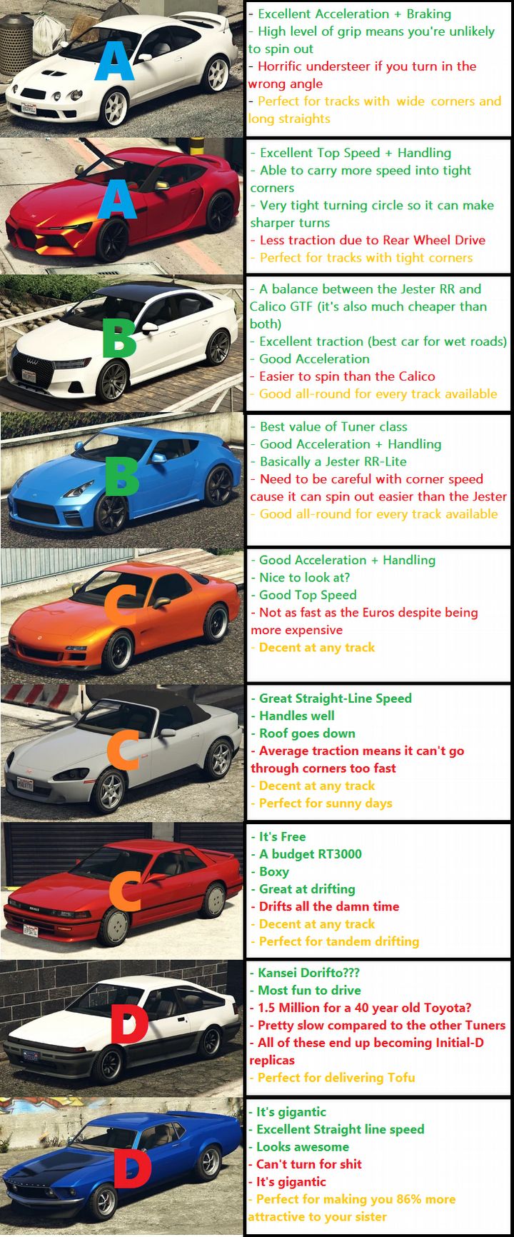 Najlepsze oceny na liście otrzymały Karin Calico GTF oraz Dinka Jester RR, czyli dwa najdroższe wehikuły z podanych. Obydwa pojazdy uzyskały wysoką notę za swoją sprawność oraz szybkość, z zaznaczeniem, że Calico nadaje się bardziej do tras z długimi prostymi oraz szerokimi zakrętami. Z kolei Jester RR sprawdzi się lepiej na trasach o węższych zakrętach. Stawkę zamykają Futo GTX oraz Dominator GTT z najgorszymi ocenami (chociaż Dominator zdecydowanie nadrabia wyglądem).