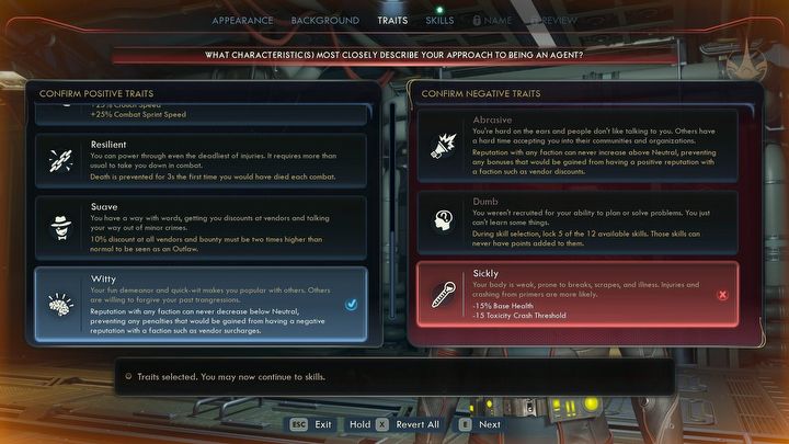 Co bardzo istotne, za darmo możecie wybrać tylko jedną pozytywną cechę. Jeżeli zdecydujecie się na dwie, gra zmusi Was do zbalansowania pozytywnych cech jedną cechą negatywną. Ostrożnie dokonujcie wyboru, gdyż źle wybrany debuff może negatywnie wpłynąć na Wasze wrażenia z rozgrywki.