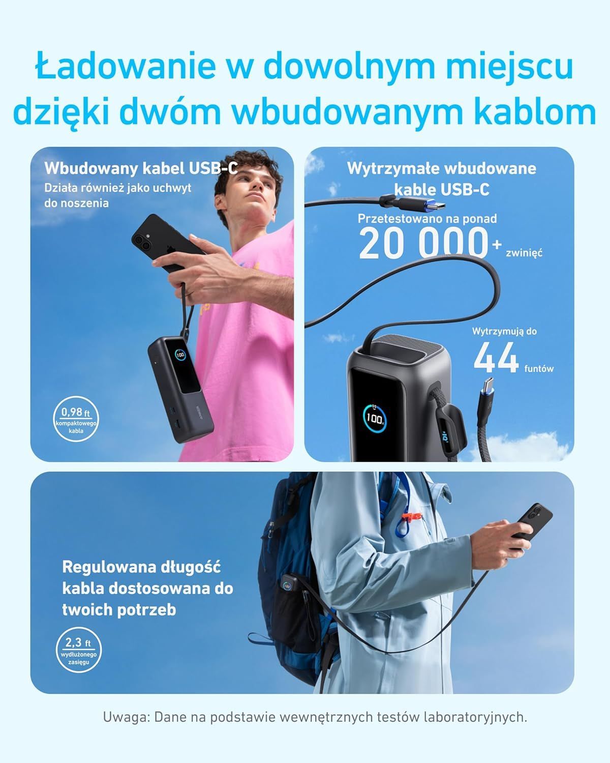 Kolejną zaletą powerbanku Ankera są dwa wbudowane kable USB-C. Mój obecny powerbank ich niestety nie posiada i bardzo tego żałuję, bo to rozwiązanie niezwykle wygodne – zwłaszcza w podróży, gdy ciągle trzeba pamiętać o zabraniu przewodu. A jeśli ktoś martwi się o ich trwałość, może spać spokojnie. Producent deklaruje, że każdy kabel wytrzyma ponad 20 000 zgięć oraz obciążenie sięgające blisko 20 kg.