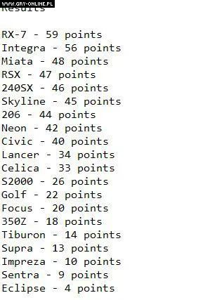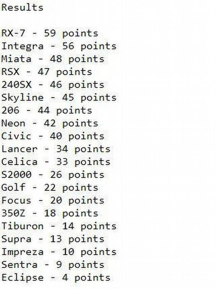Samochodem, który uzyskał najwięcej punktów w teście, okazała się Mazda RX-7. Pojazd japońskiej produkcji w teście uzyskał 59 punktów, osiągając najlepsze wyniki na dwóch z trzech przejechanych tras.