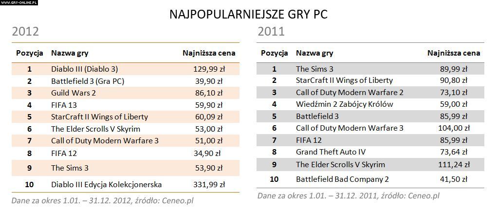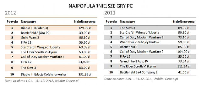 Natomiast w styczniu 2013 roku do najpopularniejszych gier należą: FIFA 13 (PS3 i X360), Kinect Sports (X360), Diablo III (PC), Battlefield 3 (PC) i The Elders Scrolls V: Skyrim (PC).