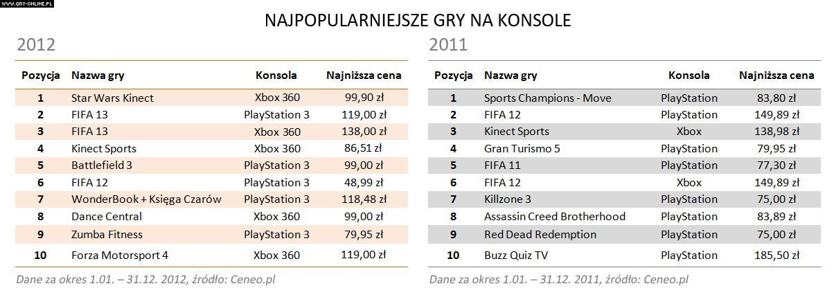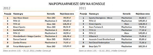 W 2012 roku serca Polaków podbił Kinect Star Wars na X360 – był to najczęściej wyszukiwany tytuł na konsole. Na drugim i trzecim miejscu znalazła się FIFA 13 w wersji na PS3 i X360. Dane, dotyczące najczęściej wyszukiwanych gier konsolowych w latach 2012 i 2011, znajdziecie poniżej: